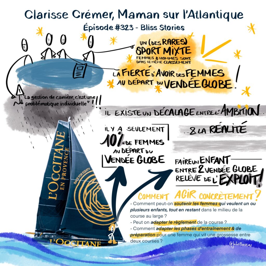 Quelle joie quand j’ai découvert que Clarisse Crémer – L’Occitane en Provence, skippeuse du Vendée Globe, avait enregistré un épisode de Podcast avec Bliss Stories ! Dans le podcast, Clarisse nous partage son histoire de maternité, mais aussi de skippeuse sur le Vendée Globe. Comme elle le dit si bien dans l’épisode, les difficultés qu’elle a rencontré avec son précédent sponsor sont le révélateur d’un sujet de société bien plus vaste : comment conjuguer la maternité & la carrière, qu’elle soit sportive ou non, quand on est une femme.